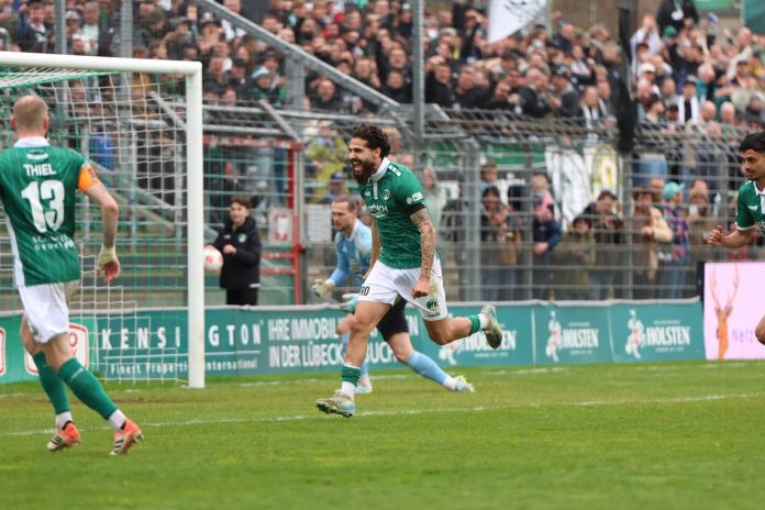 VfB Lübeck vs. 1. FC Phönix Lübeck. Mikail Polat jubelt nach dem 3:1 im 150. Lübecker Stadtderby. Foto: Lobeca/Pfaff