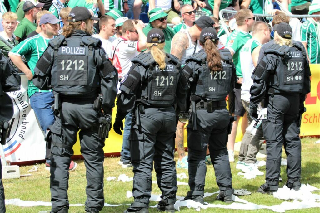 Lübeck – Lob an Flensburg: Im Wohnzimmer des Regionalligisten SC Weiche hat im Großen und Ganzen alles (außer die LED-Anzeige kurz nach dem Anpfiff) funktioniert, wurde ein guter Rahmen geschaffen für das Endspiel im Landespokal am Sonnabend im Manfred-Werner-Stadion. Das war mit 3.300 Zuschauer ausverkauft, die Stimmung war gut in beiden Fanlagern. Am Ende muss ja einer gewinnen – und das war halt der VfB Lübeck, der sich gegen einen erwartet starken Kontrahenten in der Nachspielzeit durchsetzte. Nach dem Abpfiff begann die Party. Die Mannschaft der Grün-Weißen begab sich vor der offiziellen Pokalübergabe zunächst zu den eigenen Fans und feierte ausgelassen vor der „Hinter-Tor-Tribüne“, vor dem Gästebereich (Sitzplätze in Steh umfunktioniert). Es hätte alles so schön sein können – wäre nun nicht die Polizei plötzlich „aufgetreten“ und zum eigentlichen Störenfried geworden.