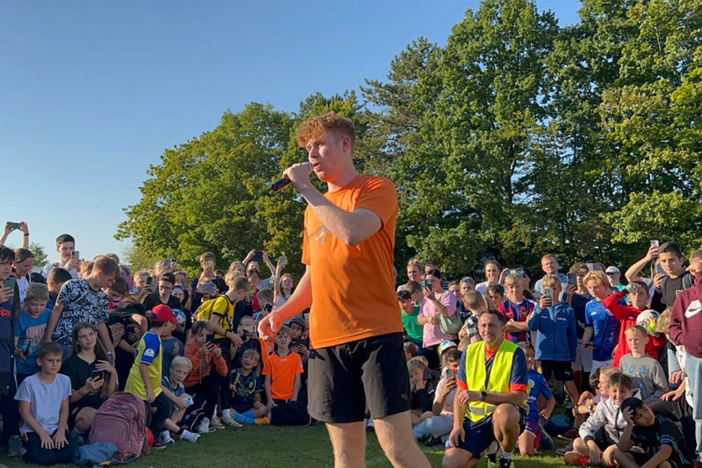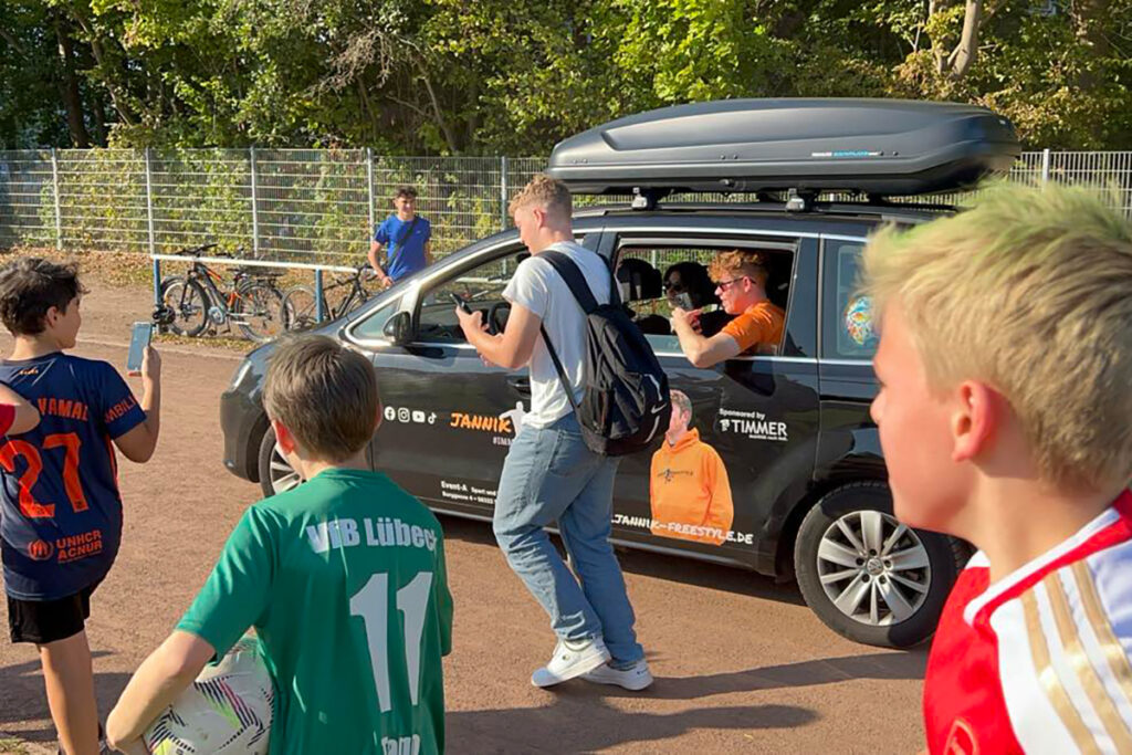 Lübeck – Der vergangene Freitag wird einigen Kids in sehr guter Erinnerung bleiben. Jannik Freestyle befuhr in seinem Promotion-Fahrzeug um 16.22 Uhr die Laufbahn des Sportplatzes von Fortuna St. Jürgen. Schnell waren die Fans am Wagen umringten ihn und klatschten mit dem 23-jährigen Ballakrobaten ab. Angekommen am Vereinsheim ging schon fast nichts mehr. Der Star von YouTube, TikTok und Instagram wurde belagert und Selfies wurden gemacht. Einmal Jannik Freestyle ganz nah sein.