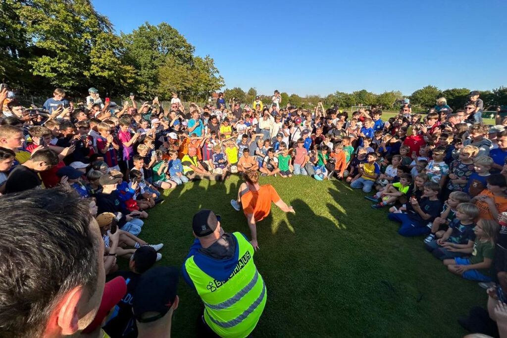 Rund eine halbe Stunde später war es dann endlich so weit. Nachdem sich der “Kumpel“ von Bayern-Profi Thomas Müller in der Kabine umzog und dort aufwärmte, ging es auf den Rasen in der Dorfstraße. Ein großer Kreis wurde gebildet und der Empfang auf dem Platz war grandios. Von zehn wurde heruntergezählt, bis Jannik Freestyle in der Mitte ankam. Der schnappte sich sofort das Mikrofon und begrüßte die Lübecker Kids. Kurz danach präsentierte er ein paar Tricks und ließ vor allem den einen oder anderen mitmachen.