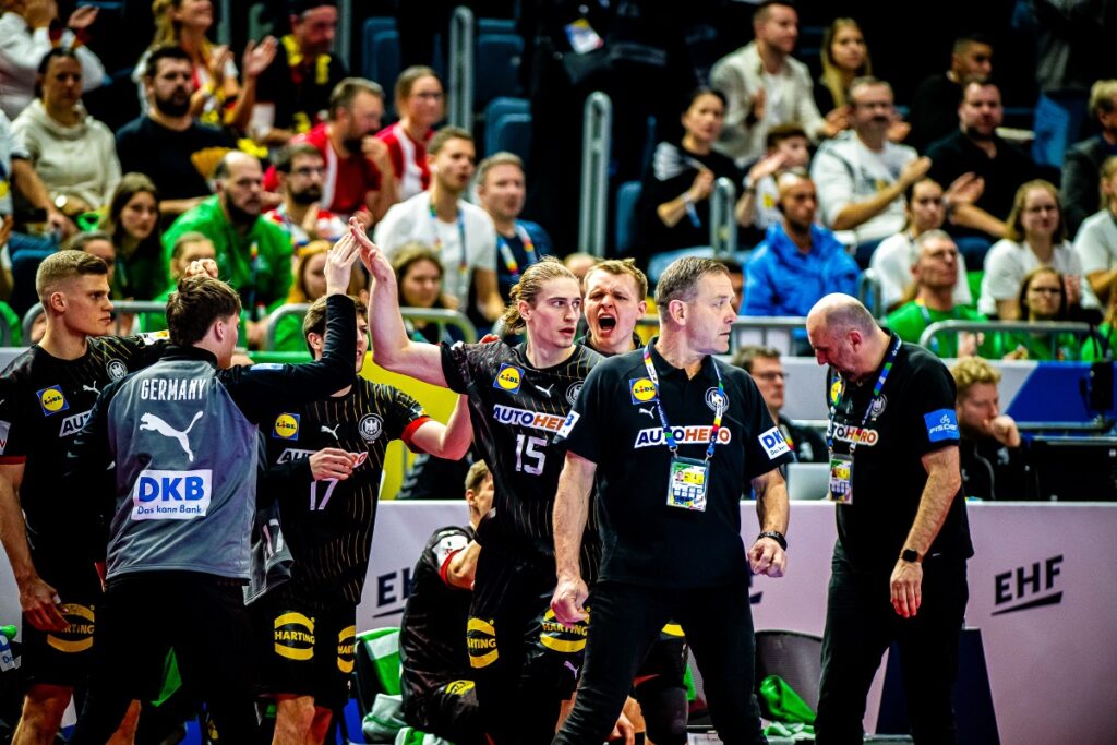 Der erste Angriff von Deutschland brachte durch Rune Dahmke das 1:0 nach 83 Sekunde, diese Führung glich Dänemark postwendend aus, als die Abwehr noch ungeordnet stand. Renars Uscins – der spätere „Man oft he Match“ – und Juri Knorr erhöhten bis zur 5. Minute auf 3:1, doch Dänemark blieb unbequem und glich zum 3:3 aus. Erneut zwei Treffer in Folge durch Dahmke und Lukas Zerbe stellten das Ergebnis auf 5:3 per Gegenstoß nach einem Steal. Es ging im abwechselnden Zwei-Tore-Takt weiter, so wurde aus dem 5:5 (11.) ein 7:5. Das DHB-Team hielt das Tempo hoch. Knorr scheitert mit einem Siebenmeter an Niklas Landin, statt des 8:6 fiel der Ausgleich zum 7:7. Während einer Zeitstrafe gegen Sebastian Heymann glich Dänemark zum 8:8 ins leere Tor aus und verpasste wenig später die Führung mit einem Wurf von Landin am leeren Tor vorbei. Im Gegenzug legten die Adler das 9:8 (20.) vor, nach einer Parade von Andreas Wolff. Es blieb ein Spiel auf des Messers Schneide, in dem sich die Mannschaft von Bundestrainer Alfred Gislason mit einem 3:0-Lauf auf 13:10 (28.) absetzte und ein 14:12 mit in die Kabine nahm.