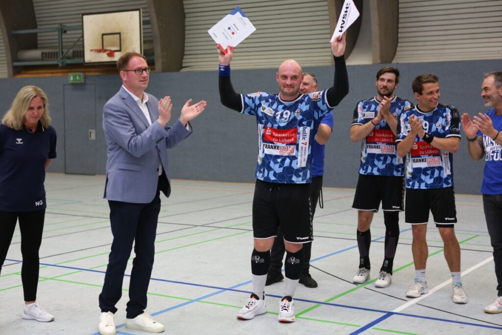Die Meisterschaft und der Aufstieg in die OL HH/SH waren bereits in trockenen Tüchern, bevor der MTV Lübeck sich vor seinen 160 begeisterten Zuschauern aus der SH-Liga mit einem deutlichen Sieg über den Tabellenvierten, den TSV Weddingstedt, verabschiedete. Es wurde zu einer Start-Ziel-Gala, die nur in den ersten Minuten ein wenig ausgeglichen blieb. Nach dem 5:4 in der 7. Minute zog die Mannschaft, um das Trainergespann Mirko Baltic und Thomas Steinkrauß, einsam ihre Kreise und nahm nach einem 10:5 (12.) eine bereits vorentscheidende 20:13-Führung mit in die Kabine.