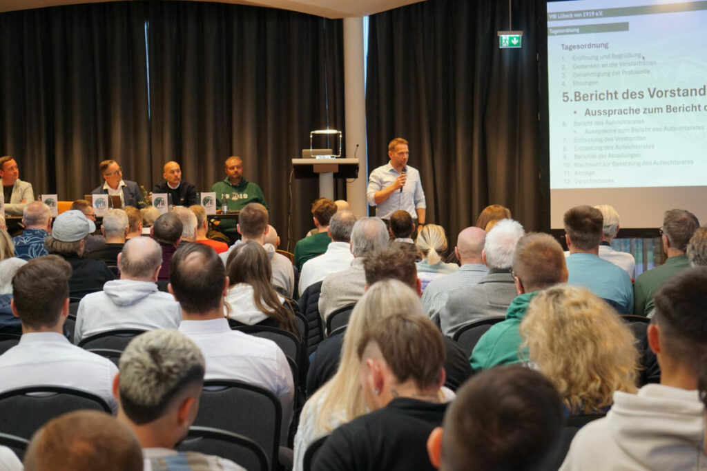 Lübeck – Nach der 2:7-Klatsche bei der SV Drochtersen/Assel und der langen Heimfahrt an die Lohmühle am Freitagabend, saßen die Spieler des VfB Lübeck schon am nächsten Vormittag im “JUNIPER“ und verfolgten zum Teil die Jahreshauptversammlung ihres Arbeitgebers. Zusammen mit ihnen waren rund 200 Mitglieder anwesend.