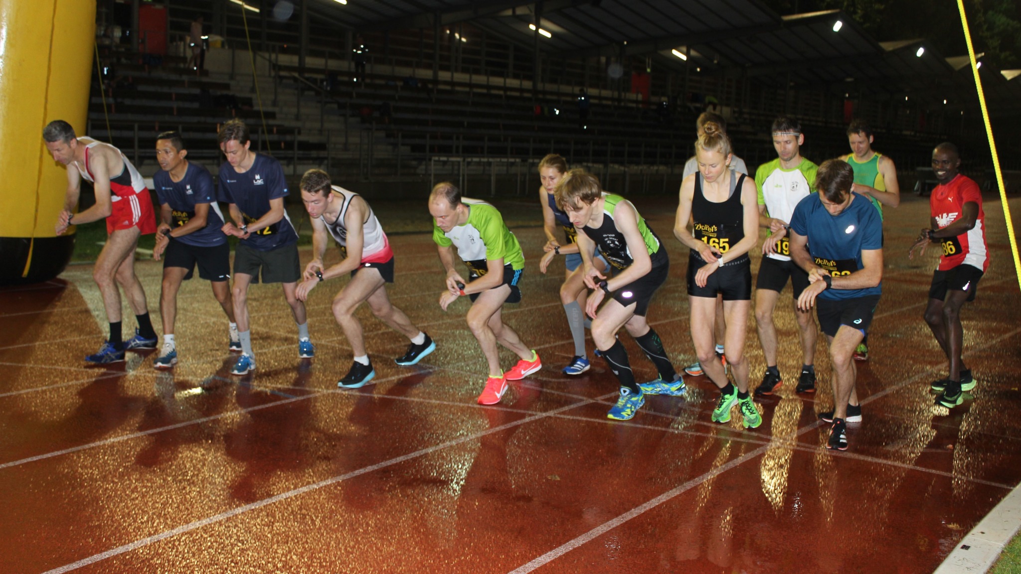 Regenpeitschen, Sturmböen und die Pfützen auf der Laufbahn verlangten alles von den Beteiligten auf und an der Bahn, im Zielbereich beim Rundenzählen und bei der Zeitnahme. Und bei der Aufrüstung, wenn die kleinen Partyzelte nicht mehr Regen- und Windschutz boten, sondern abhoben oder der Zielbogen im Sturm wankte. Die Bilanz: Vier Läufe, 59 Aktive und im späten Flutlicht nach mehr als vier Stunden die Siegerehrung.