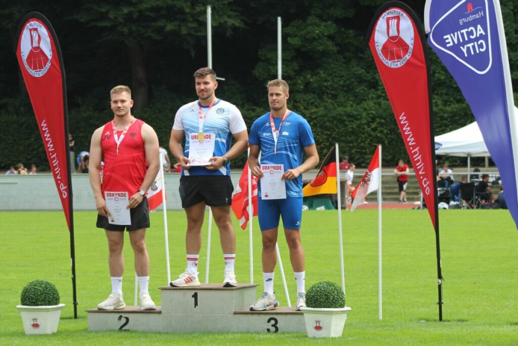 Weitere Medaillengewinner im Trikot des SC Rönnau 74: Johann Fichtner (Stabhochhochsprung U18, Silber mit 4,30 m); Bjanre Lütjens (Hammer U18; Bronze mit 44,84 m).