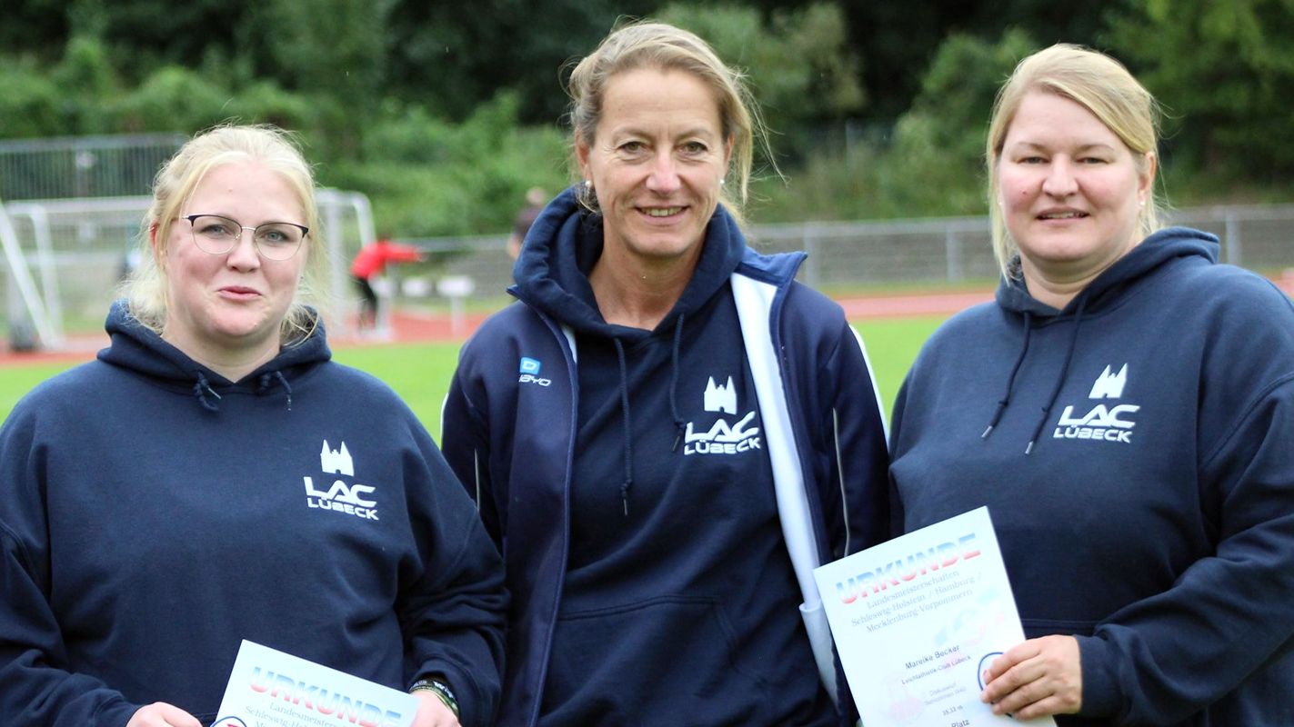 Jennifer Schröder (10,90 m/W30), Mareike Becker (11,72 m/W40) und Ina Tietgen (11,30 m, persönliche Bestleistung/W50) siegten im Kugelstoßen in ihren jeweiligen Altersklassen.