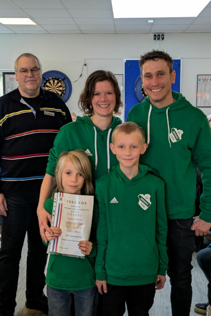 Besonders geehrt wurde Familie Nötzel, die sich über vier Gutscheine freuen durfte. Diese wurden feierlich von Günter Frenz, Sportabzeichen Obmann im Kreis Ostholstein, in der Rubrik Familien-Sportabzeichen überreicht.