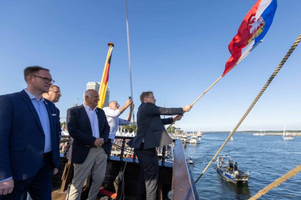 Lübeck – Mit dem traditionellen Signal „Heißt Flagge!“ eröffnete Lübecks Bürgermeister Jan Lindenau am Freitagabend offiziell die 136. Travemünder Woche. Wenige Minuten später schwenkte Ministerpräsident Daniel Günther die Landesflagge Schleswig-Holsteins und gab damit das Startsignal für die Langstrecken-Regatta „Rund Fehmarn“. Für die Zuschauerinnen und Zuschauer ein besonderes Erlebnis: Zum ersten Mal startete das Segelrennen direkt im Anschluss an die Eröffnungszeremonie – ganz im Sinne der engen Verzahnung von Sport und Festival an Land.