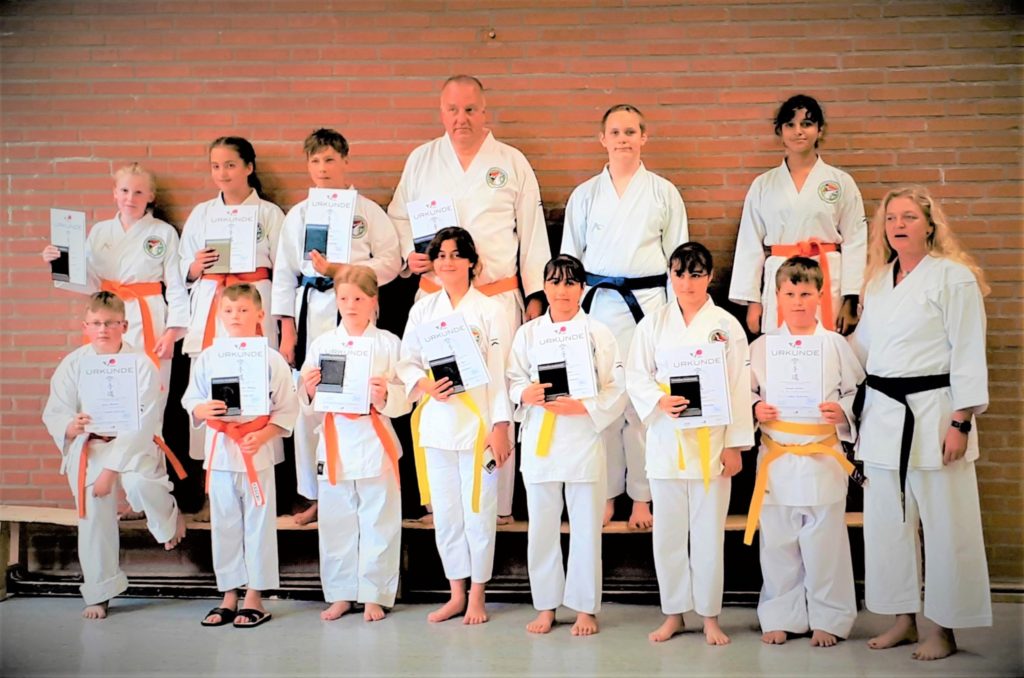 Zum 7. Kyu (Orangegurt) traten Beeke, Yalda, Jannis, Sina-Sophie, Celina, Anakin-Lian und Jörg an. Auch sie erfüllten nach Meinung des Prüfers die geforderten Leistungen und waren stolz, sich nach der Prüfung den orangenen Gürtel umbinden zu dürfen, denn nur wer eine technische Prüfung vor einem lizensierten Prüfer ablegt, darf die nächst höhere Graduierung offiziell tragen.