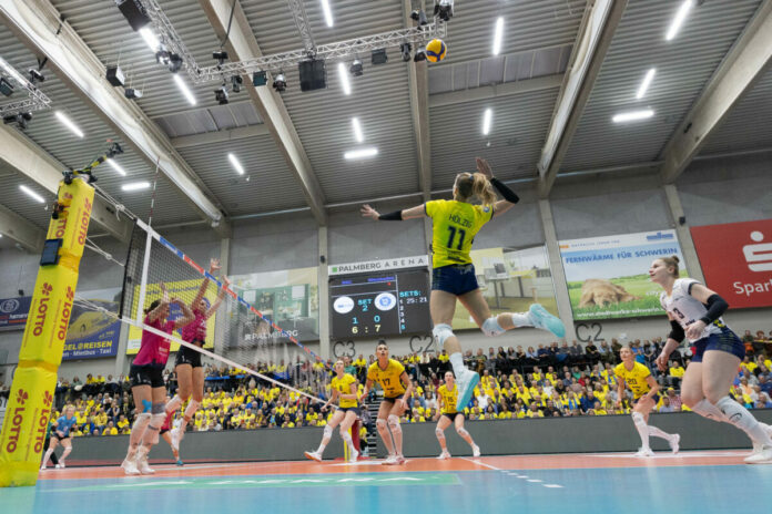 Schwerin – Der SSC Palmberg Schwerin hat sich in der vorweihnachtlichen Partie in der Bundesliga gegen den VC Wiesbaden mit einem souveränen 3:0-Erfolg selbst und seinen Fans ein frühes Weihnachtsgeschenk gemacht. Nach einem ausgeglichenen Beginn übernahm der SSC in allen drei Sätzen zunehmend die Kontrolle und überzeugte mit druckvollen Aufschlägen, stabiler Abwehrarbeit und variablen Angriffen. Mia Kirchhoff und Kapitänin Anne Hölzig führten ihr Team als verlässliche Scorerinnen an, während Schwerin in den entscheidenden Phasen stets die besseren Lösungen fand. Vor rund 2.000 Zuschauern in der stimmungsvollen PALMBERG ARENA sicherte sich der SSC die Sätze mit 25:21, 25:21 und 25:20, Hölzig wurde nach starker Leistung zur MVP des Abends gewählt.