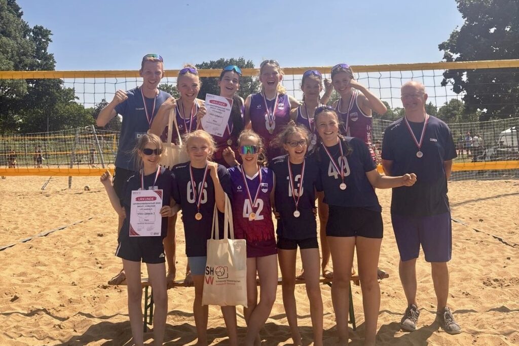 Lübeck – Vergangenen Sonnabend lud die VSG Lübeck zu den Landesmeisterschaften im Beachvolleyball der Altersklasse U15 ein. In dieser Altersklasse spielen Vierer- bis Sechserteams eines Vereins jeweils drei Sätze gegen andere Vereine. Dabei werden die ersten beiden Sätze im klassischen Beach-Modus zwei gegen zwei gespielt und der dritte Satz vier gegen vier. Bei den Jungs und Mädchen waren jeweils zwei VSG-Teams am Start. Als Ziel wurde jeweils Gold und die Qualifikation für die Deutschen Meisterschaften ins Visier genommen.