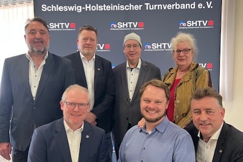 v. hinten links: Dirk Engelbrecht, Sven Wüst, Hans-Jürgen Kütbach, Maren Schümann v. vorne links: Axel Kraft, Finn Blunck, Stefan Diephaus (Geschäftsführer). Foto: Schleswig-Holsteinischer Turnverband/oH
