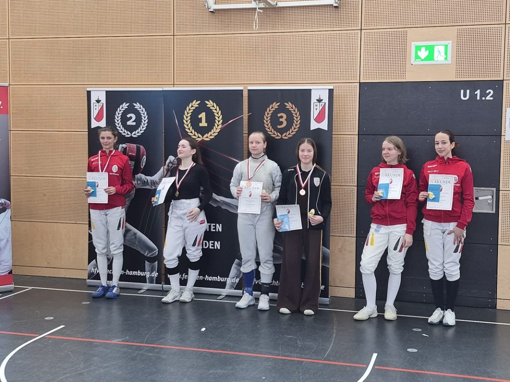 Am 29. März führte es erneut zwei Lütjenseer nach Hamburg. Dieses Mal standen die offenen Hamburger U20-Landesmeisterschaften in allen Klassen an. Für den FC Lütjensee kreuzten Flynn Jonathan Beu und Anastasia Winternheimer ihre Säbelklingen. Für Beu lief es in der Vorrunde nicht besonders gut, denn er verlor alle drei Duelle deutlich gegen seine Kontrahenten. Im Halbfinale steigerte er sich aber enorm, konnte das Duell lange offenhalten und blieb am Ende sehr knapp mit 12:15 unterlegen. So blieb am Ende die Bronzemedaille. Bei Winternheimer lief es bei der Damen-Vorrunde besser. Sie schlug zwei ihrer fünf Kontrahentinnen und wurde Vorrundendritte. In der ersten Direktausscheidung sah es sehr lange nach einer „Klatsche“ aus, da sie mit 5:10 schon aussichtslos zurücklag. Doch danach machte sie Treffer auf Treffer gut und gewann noch mit 15:10. Im Halbfinale konnte Winternheimer an die Leistung dann nicht ganz anknüpfen und verlor 9:15 – was aber ebenfalls mit einer Bronzemedaille belohnt wurde.