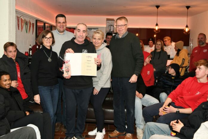 Vor der Eingangstür hatten sich mittlerweile Adelbert Fritz, Verena Lemm und Henrik Bagdassarian vom Kreissportverband Stormarn sowie Renate Bruns von der Sparkasse Holstein versammelt, um gemeinsam mit Ohes Vorsitzendem Daniel Schmitt die als Überraschung geplante Ehrung durchzuführen und ein paar lobende Worte vor versammelter Mannschaft an Yuji zu richten. Dotiert war die Auszeichnung für außergewöhnliches ehrenamtliches Engagement mit einer Urkunde und einem Sachgutschein über 250 Euro.