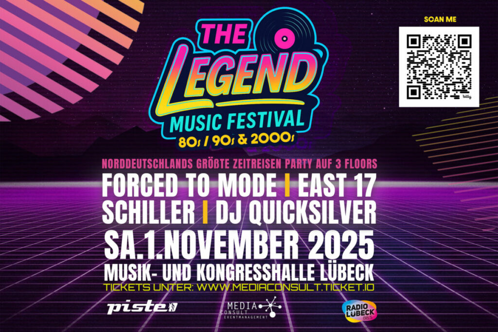 Lübeck – Am kommenden Sonnabend (1.11.) wird die Musik- und Kongresshalle zum Treffpunkt für Freunde der 80er, 90er und 2000er. Beim Legend Music Festival stehen mehrere Kult-Acts auf der Bühne: Neben Forced to Mode, der wohl bekanntesten Depeche-Mode-Tribute-Band Europas, treten auch die Originale East 17, DJ Quicksilver, Schiller sowie Michael Wittig als Resident-DJ auf. Ein Abend, der musikalische Legenden und elektronische Welten miteinander verbindet – mitten in der Hansestadt.